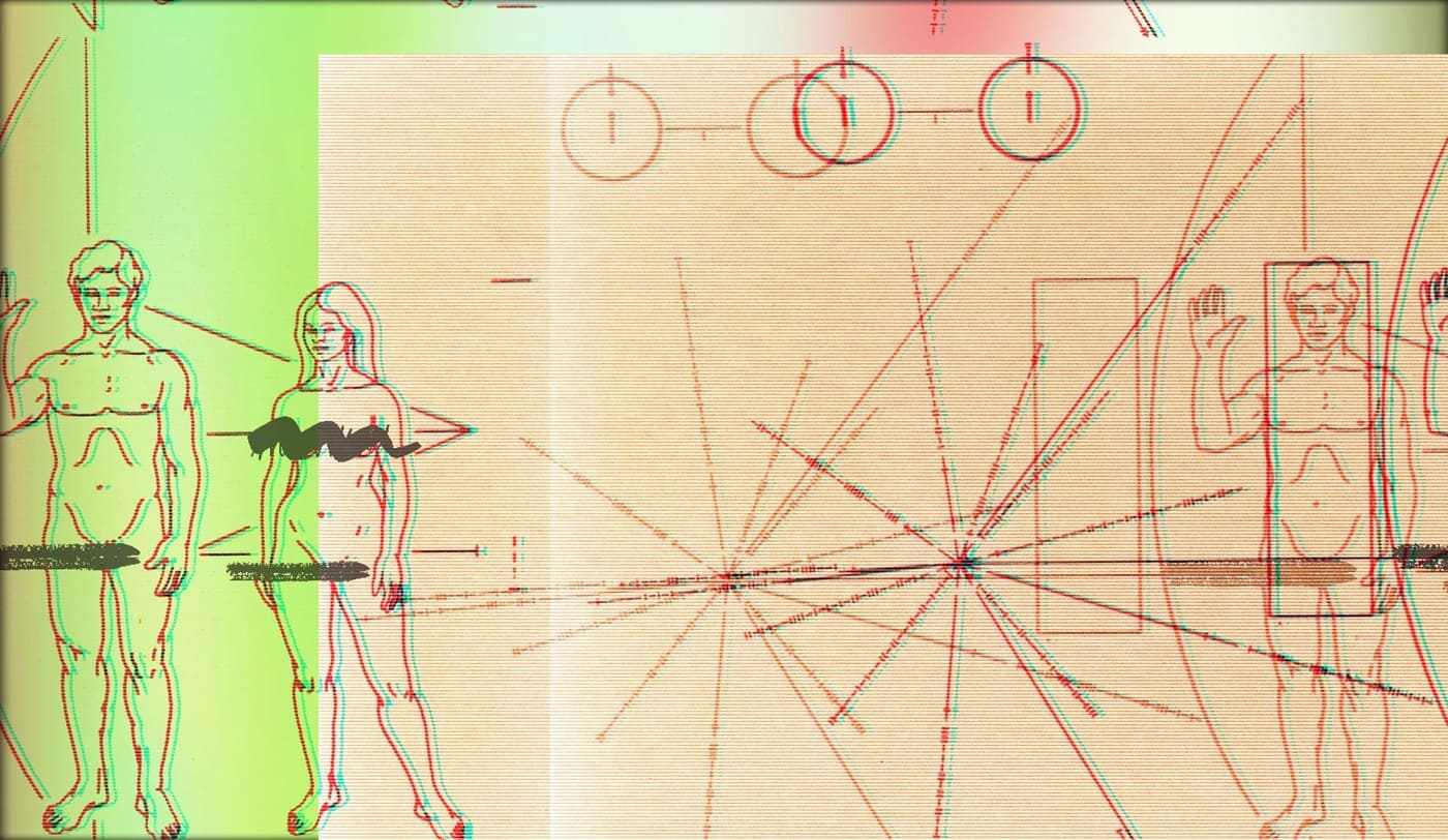 Sagan, Drake y Salzman se atrevieron a pensar que era importante informar a los posibles seres de otros mundos dónde estaba nuestro planeta. Y es probable que dieran por sentado que estos seres de otros mundos entenderían nociones como planeta. Partiendo de la suposición —muy humana— de que la física, la química y las matemáticas —terrestres— fuesen una especie de lenguaje universal —porque así se han construido discursivamente—, en diciembre de 1971 estas tres personalidades comenzaron a trabajar en un peculiar diseño de un conjunto de representaciones visuales del sistema solar, la sonda misma, la Tierra, el átomo de hidrógeno, 14 pulsares y los cuerpos desnudos de dos figuras humanas (una masculina y otra femenina). Esto dio como resultado la siguiente representación.