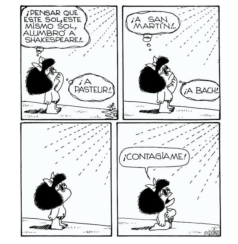 El pasado 30 de septiembre (de este 2025) se cumplió un lustro del fallecimiento de don Joaquín Salvador Lavado Tejón; es decir: Quino; es decir: el creador del personaje de historieta más famoso de Argentina y uno de los más queridos del mundo hispanohablante: Mafalda, quizá la niña más contestataria del humor gráfico. Como lo dejó apuntado Umberto Eco: “Mafalda no es solamente un personaje de historieta más; es, sin duda, el personaje de los años setenta. Si para definirla se ha utilizado el adjetivo «contestataria», no ha sido para alinearla en la moda del anticonformismo a toda costa: Mafalda es de verdad una heroína iracunda que rechaza al mundo tal cual es”, escribió en su momento el semiólogo y filósofo italiano. Más terrenal fue el gran Julio Cortázar: “No tiene importancia lo que yo pienso sobre Mafalda. Lo importante es lo que Mafalda piensa de mí”, dicen que dijo un día el escritor argentino sobre la pequeña niña. Y sí: todos la aman. Rebelde y feminista, Mafalda es, de acuerdo con la descripción de su autor, Quino, “una niña que intenta resolver el dilema de quiénes son los buenos y quiénes los malos en este mundo”. Nombre esencial de la caricatura latinoamericana, Quino fue asimismo autor de incontables viñetas que abordaron diversos temas; con humor ácido, satirizaba lo mismo sobre la política, el poder, las desigualdades sociales, la burocracia, el mundo moderno, y, claro, la vida misma. En un texto dedicado al caricaturista, publicado en estas mismas páginas, Víctor Roura apuntaba: “Es probable que ni el mismo Quino, ese ilustre humorista argentino, supiera cuántos dibujos realizó en sus casi nueve décadas de vida. Cuando celebró sus 70 años, la Editorial Lumen dio a conocer, al principiar el año 2002, el volumen Esto no es todo, que en un poco más de 500 páginas, en gran formato, reunió medio millar de impresionantes cartones de don Joaquín Salvador Lavado. La antología es la primera que se efectuaba al margen de su gran obra: Mafalda, que ya ha sido editada íntegramente, en 660 páginas, por la sudamericana Ediciones de la Flor”. | En la imagen, una de las viñetas clásicas de Quino, tomada del libro Todo Mafalda.