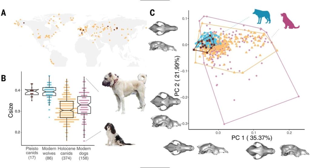 Diversidad geográfica y temporal, tamaño y variación de la forma del cráneo en los especímenes de cánidos analizados. / Ilustración: Science.