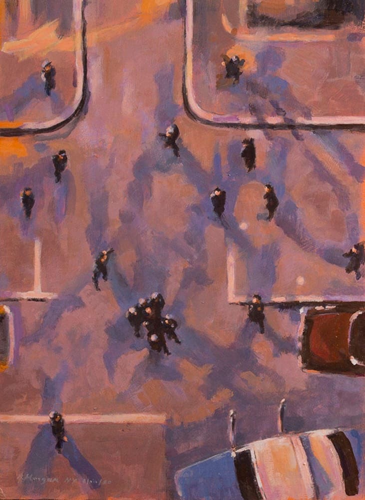 El cuadro de Robert Morgan que representa su vista de la escena del crimen de John Lennon desde la ventana de su casa, con los policías llevando al músico agonizante hacia un coche. / Foto: Robert Morgan / El País.