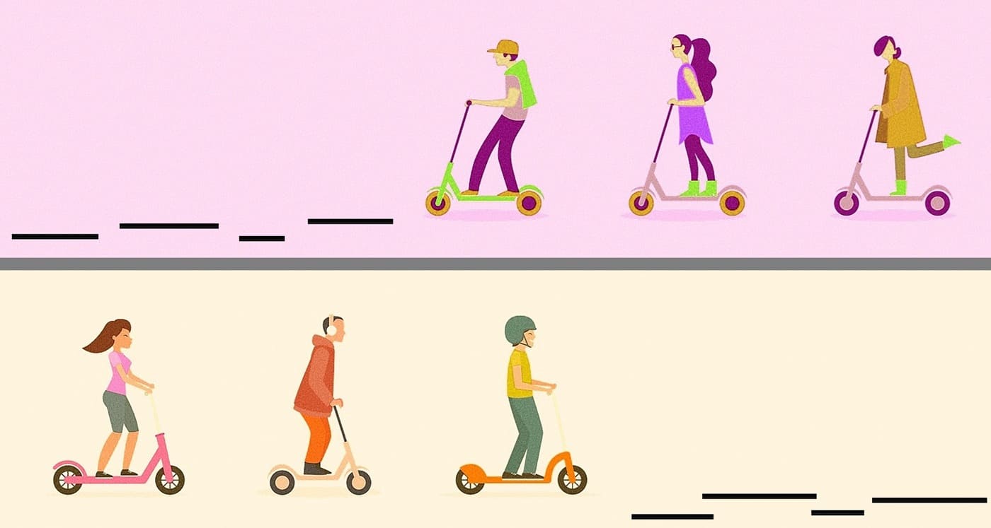 Tienen un toque de estética gay, es decir, del estilo que este colectivo ha ido cuidadosamente construyendo como modo de reconocimiento e identidad, en la vestimenta y el ademán: van con ropa entallada, espalda recta, pelo corto, musculatura de gimnasio, de punta en blanco, derechitos, con gallardía de diseño. Y los scooters son igual: compactos, firmes, verticales, impecables, macizos, siempre de pie, peripuestos, como de una sola pieza. Es como si la potencia o efectividad no tuviera que ver con el esfuerzo o el desarreglo, lo cual es una postura muy contraria y opuesta a la actitud flagrante de la velocidad, culturalmente masculina y ciertamente machista, que es en pose aerodinámica, como de Ferraris o motocicletas creyéndose misiles, igual que las bicicletas de carreras o los patinadores callejeros.